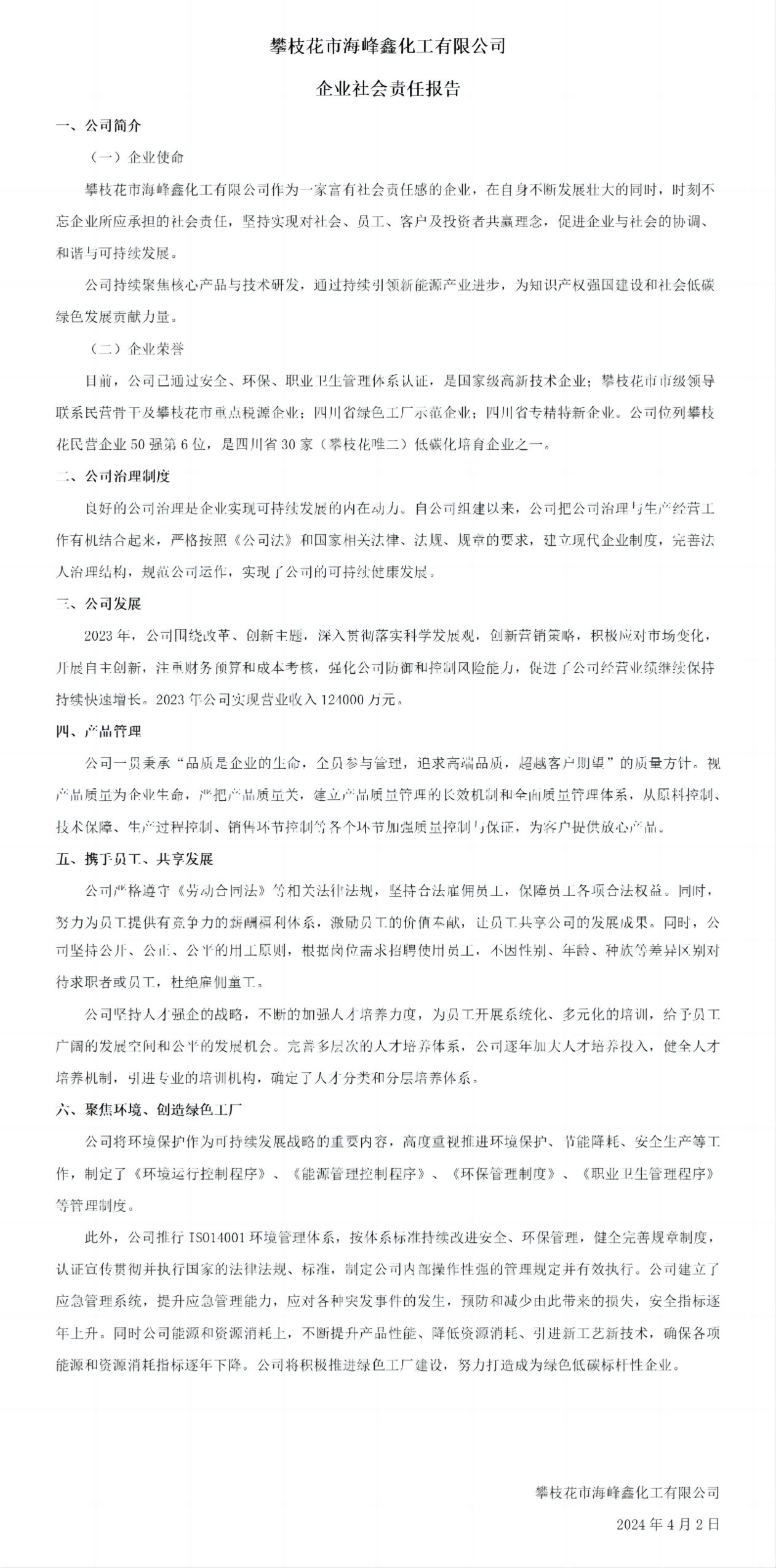 攀枝花市海峰鑫化工有限公司社會責任報告